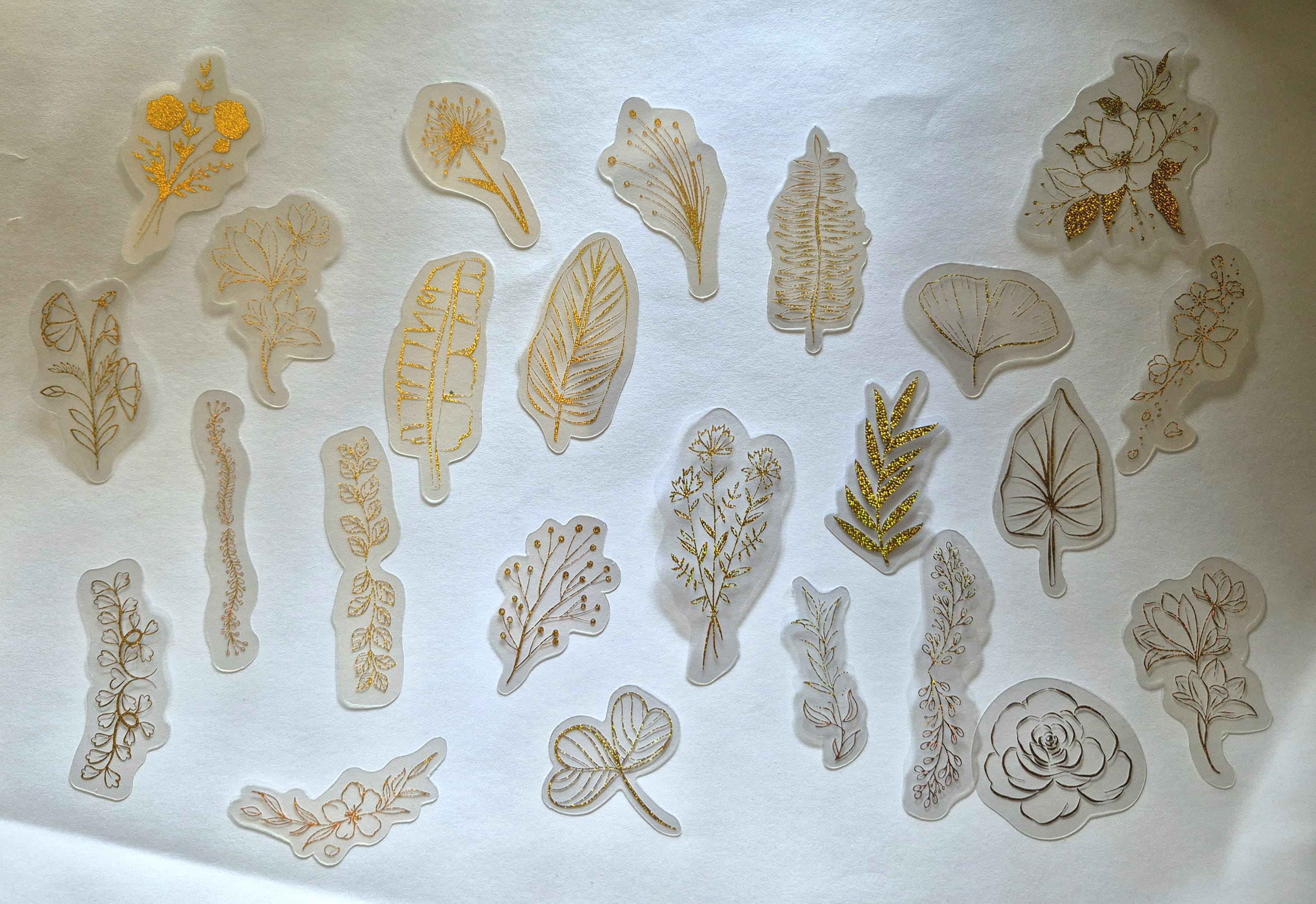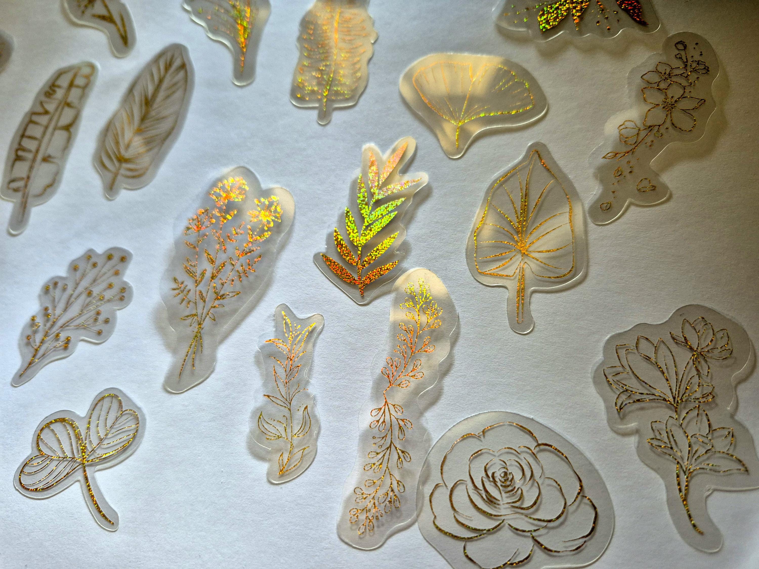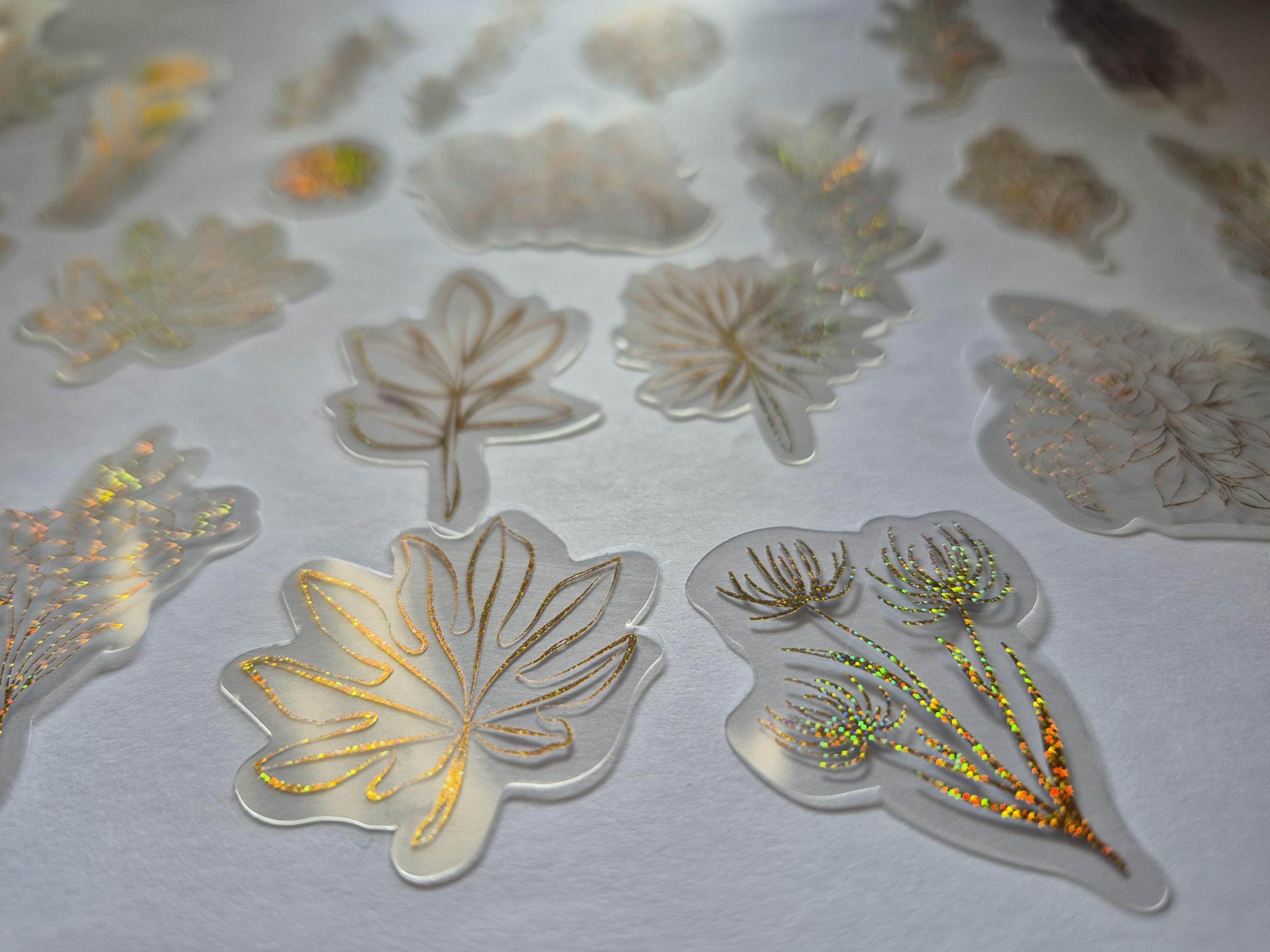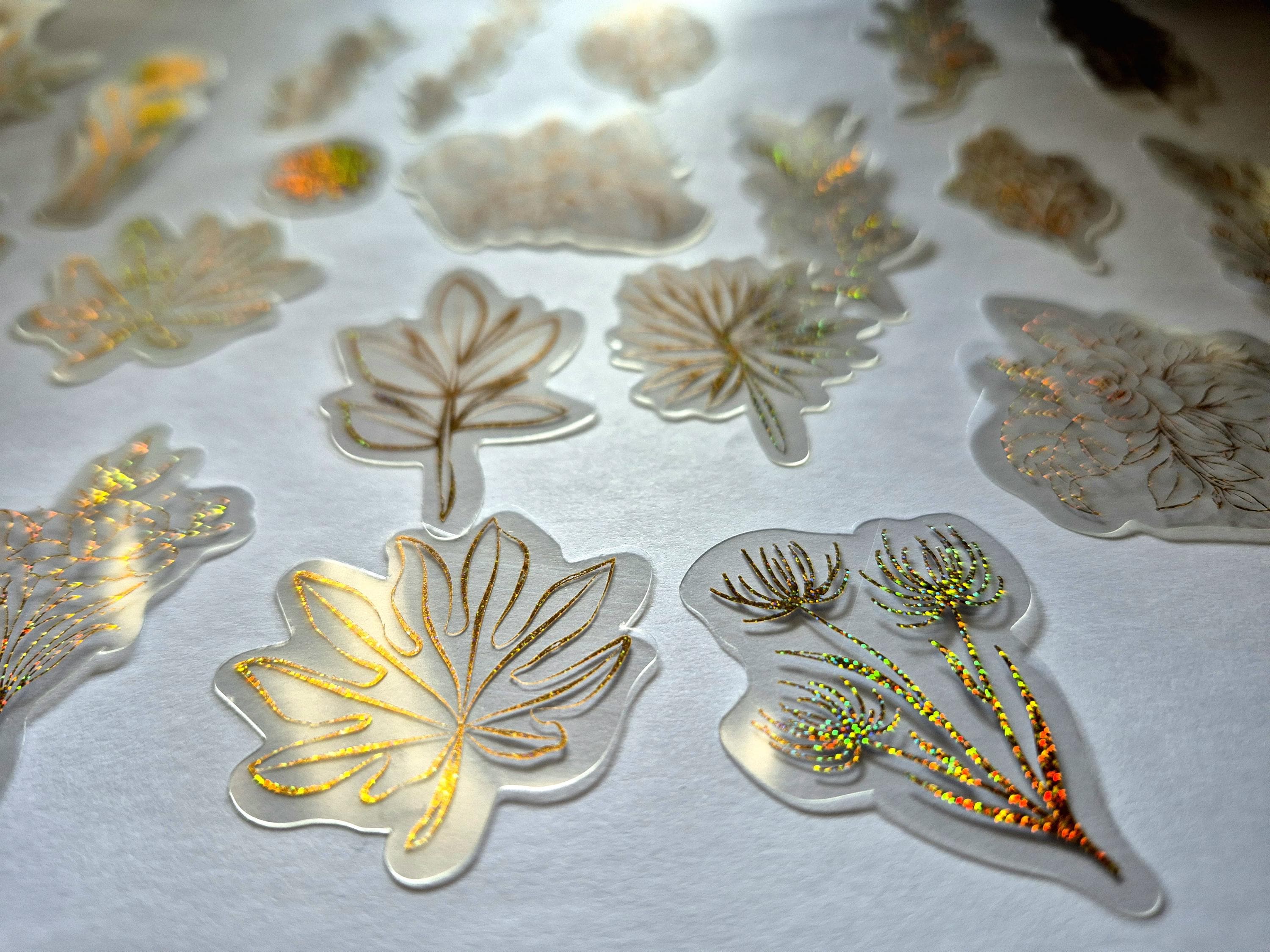 Golden Glitter plants and leaves, PET Adhesive Stickers, Waterproof Transparent Label 40/80 pieces Colorful Laser PET Stickers for water bottle stickers aesthetic Scrapbooking Decoration DIY
