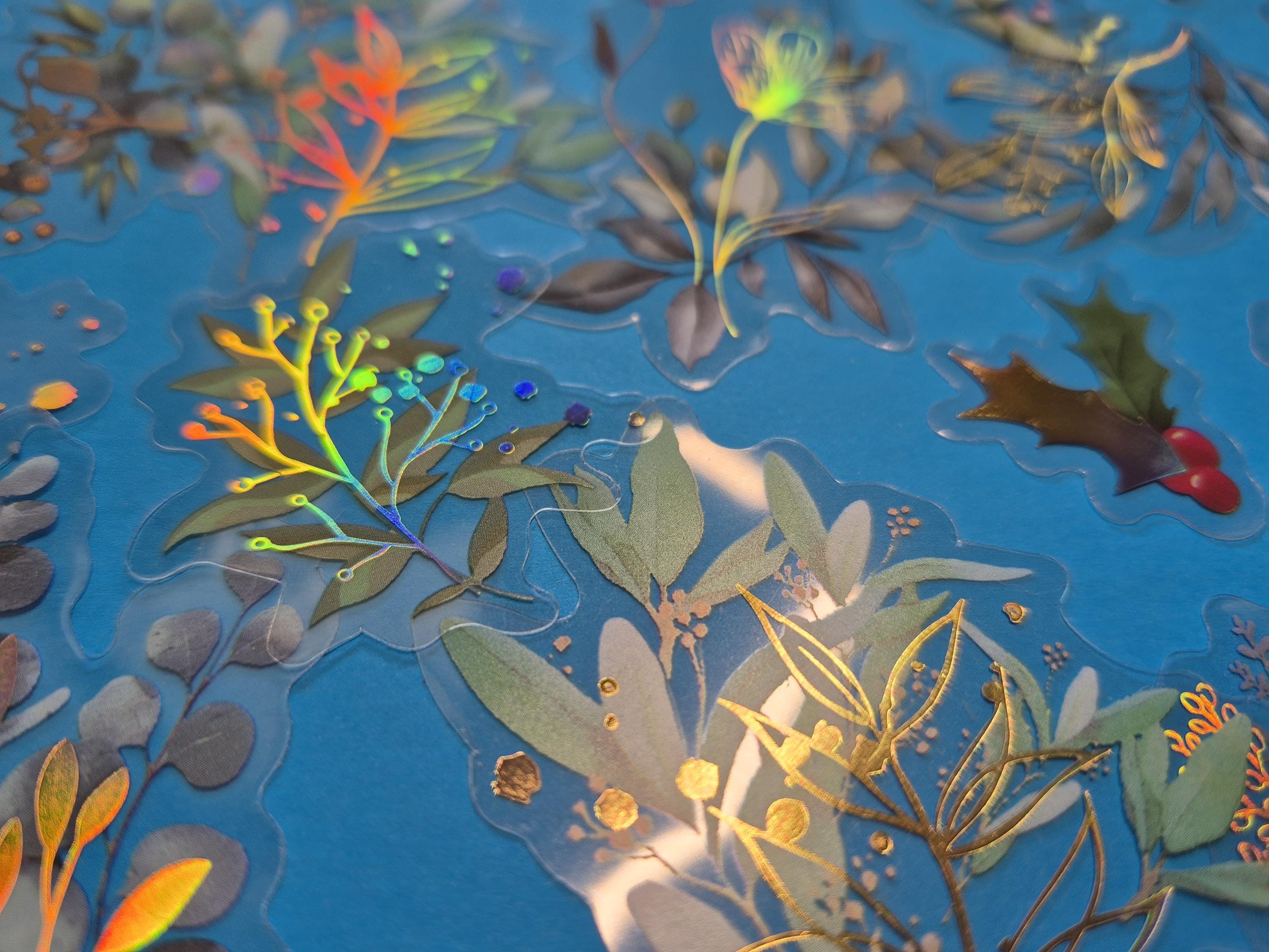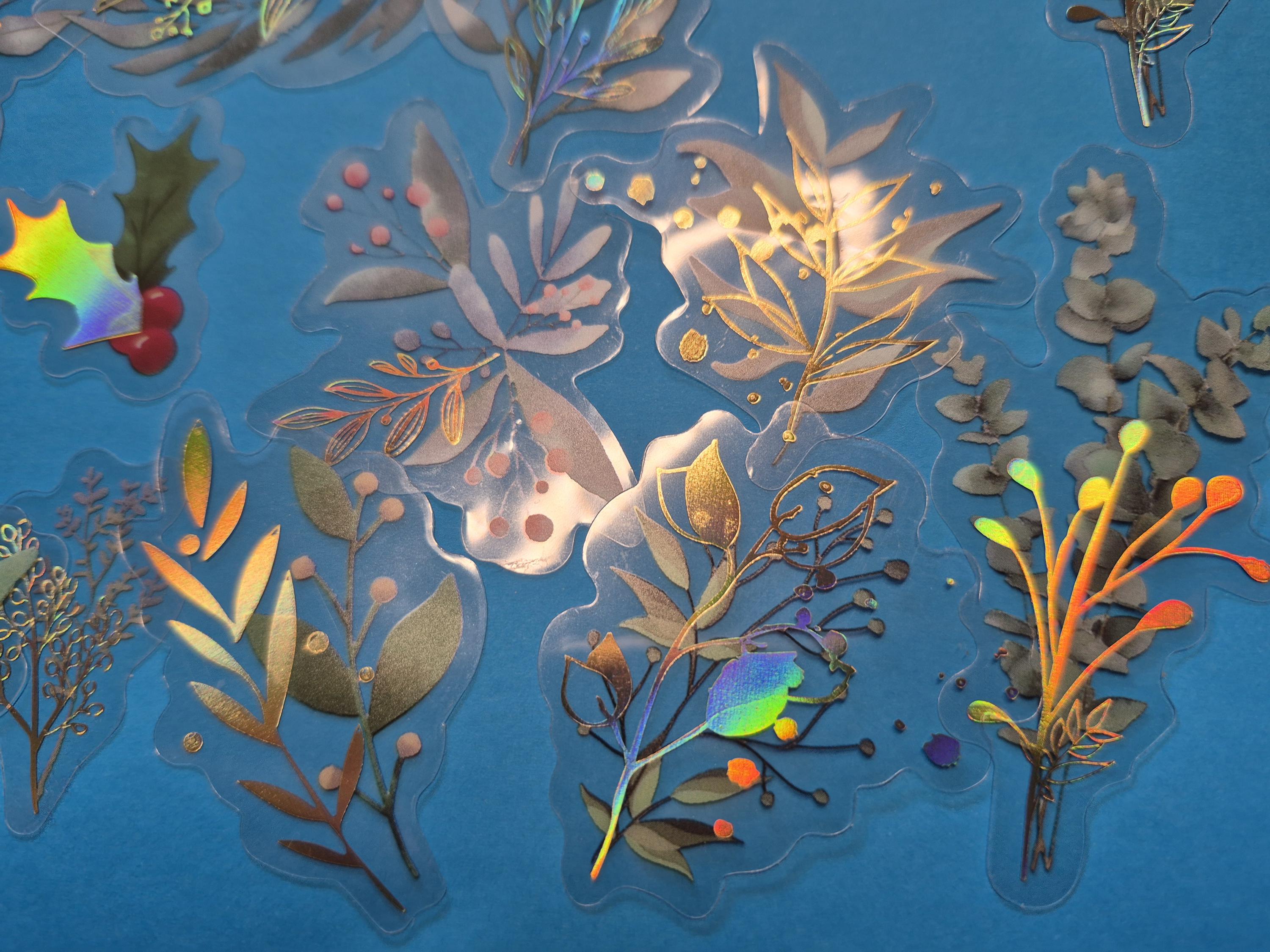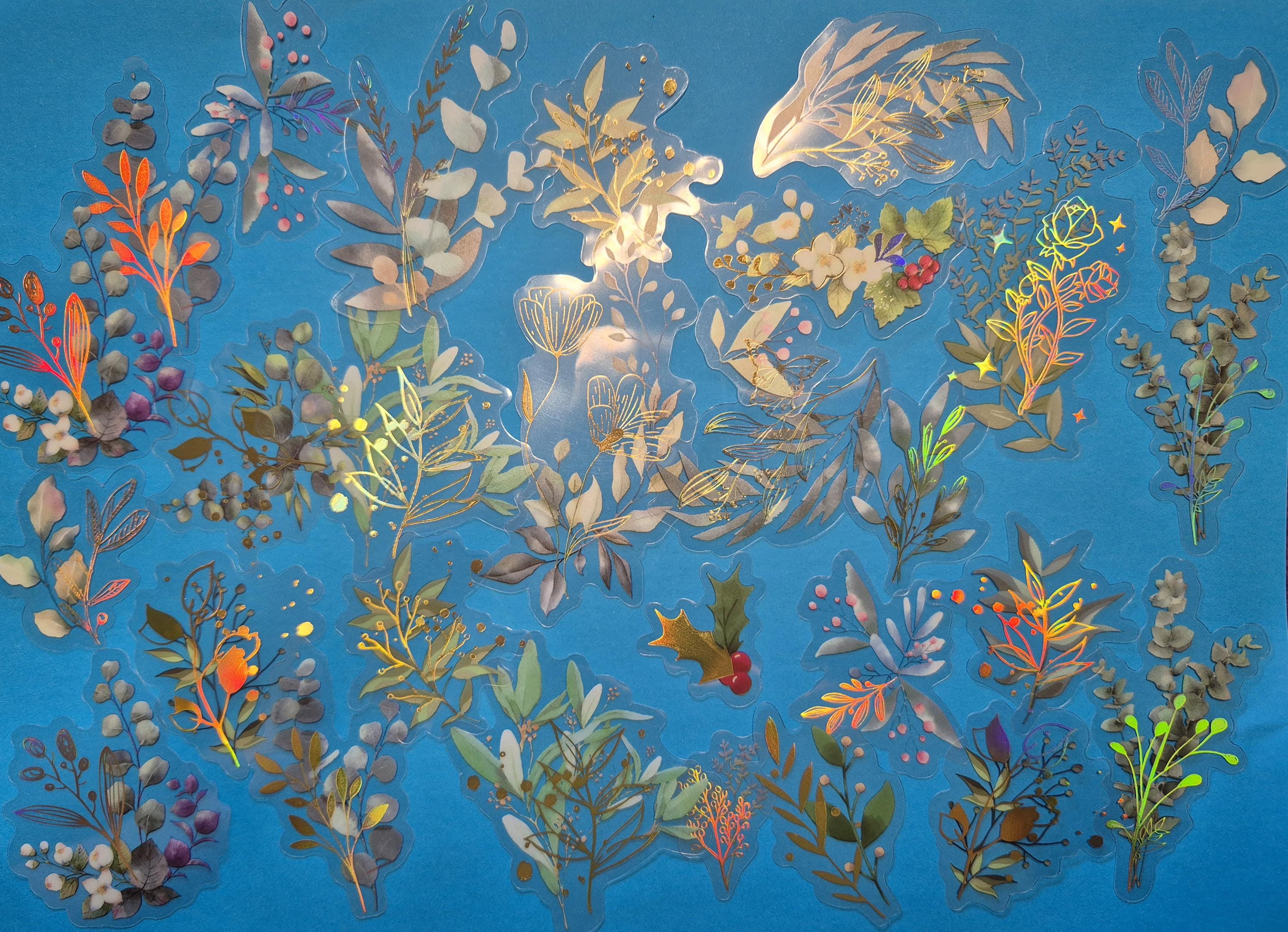 Golden Glitter plants, PET Adhesive Stickers, Waterproof Transparent Label 20/40 Sheets Colorful Laser PET Stickers for water bottle stickers aesthetic Scrapbooking Decoration DIY